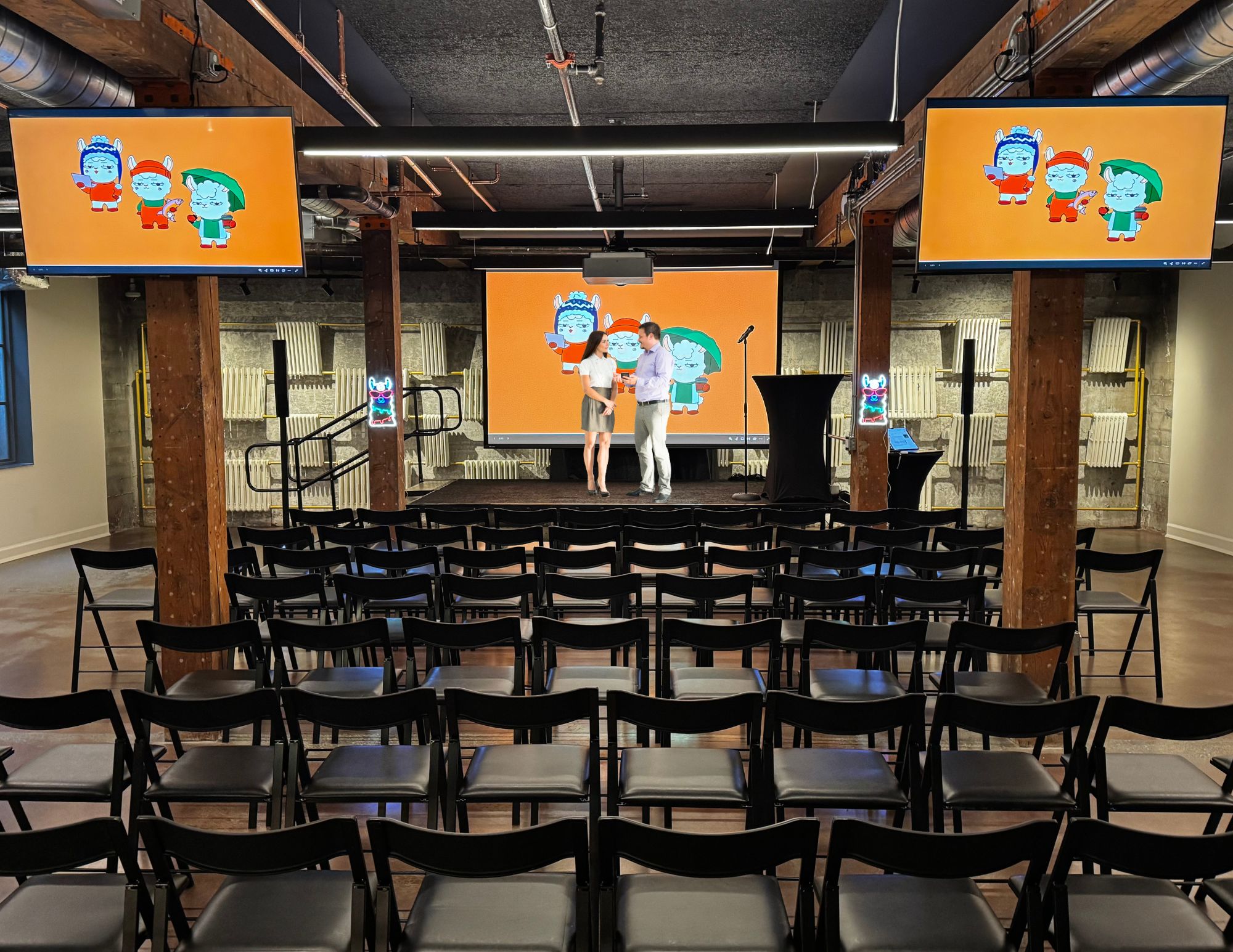 Get cozy in the Slinky conference room, which is optimal for team breakouts and off-site planning sessions. Located with easy access from the building lobby, high-top seating at a sleek, modern table awaits your group.
